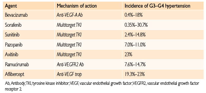 高血压和癌症常在同一病人中并发,应按基线筛选拟用抗angi生物剂治疗的病人高血压和现有肾病应在开始治疗前实施或优化高压治法,以防止因变原诱发高血压并避免产生严重复杂问题推荐用抗angi生药处理时重复BP测量法,目的是实施早期主动抗超常法以维护BP<140/90mmHg,而不是撤销处理法因为这些病人增加LVD风险,优先防超试剂应该包括ACE抑制器和二合金钙阻塞器,尽管有极小数据显示一种代理优异性sorafenib诱发高血压应避免非二联苯CCBs,因为药物交互作用可能导致高水平sorafenib循环BP为>200mmHg,异端BP>100mHg或超强度危机时可适用解析处理