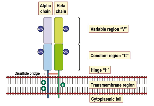 TCR由二链组成,通常是A和B类似BCR链式链式变量常量域.